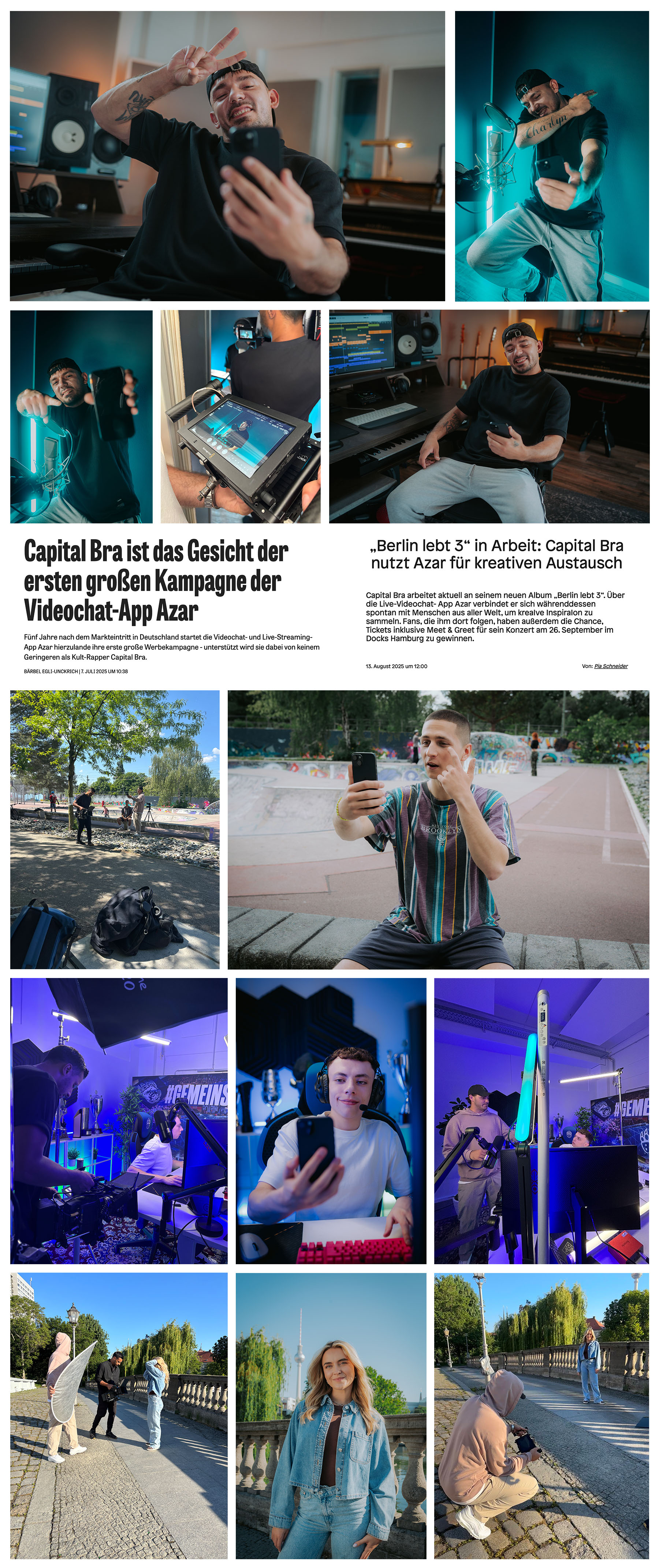 Für die erste große Deutschland-Kampagne der Videochat- und Live-Streaming-App Azar haben wir gemeinsam mit Kult-Rapper Capital Bra ein aufmerksamkeitsstarkes Video auf die Beine gestellt. Ziel war es, die App fünf Jahre nach dem Markteintritt in Deutschland mit einem lauten Knall in den Fokus der Gen Z zu rücken – und wer könnte das besser als Capi?